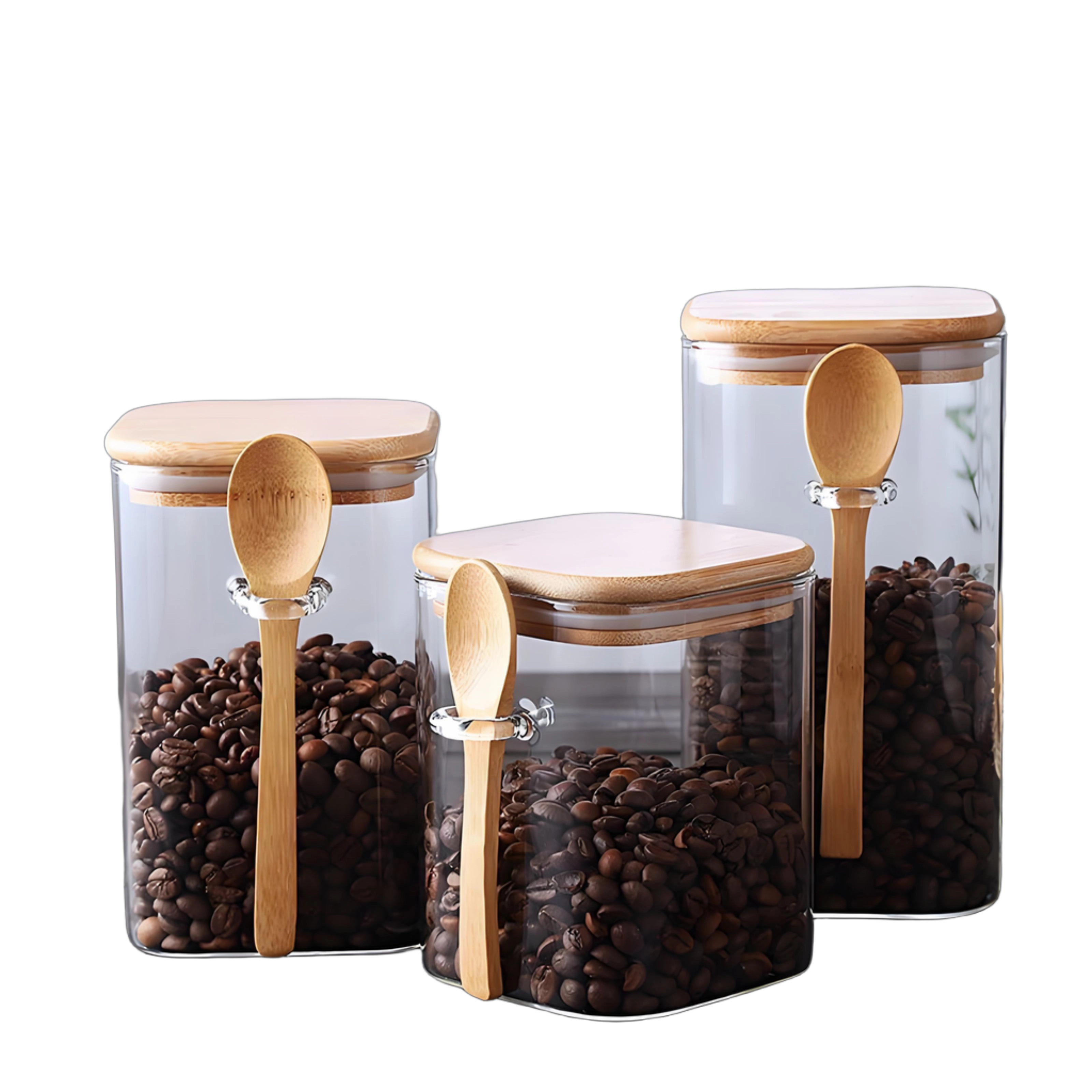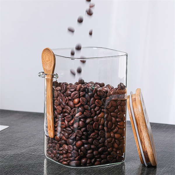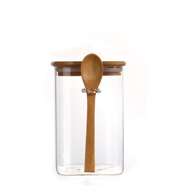 Square high borosilicate glass jar with bamboo lid and wooden spoon
